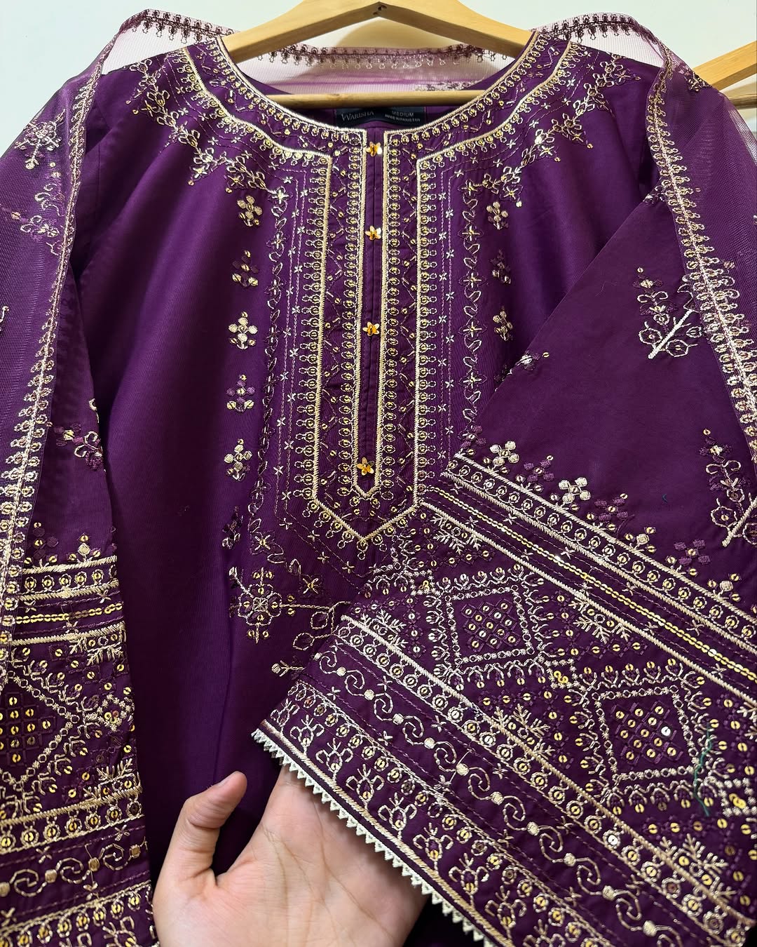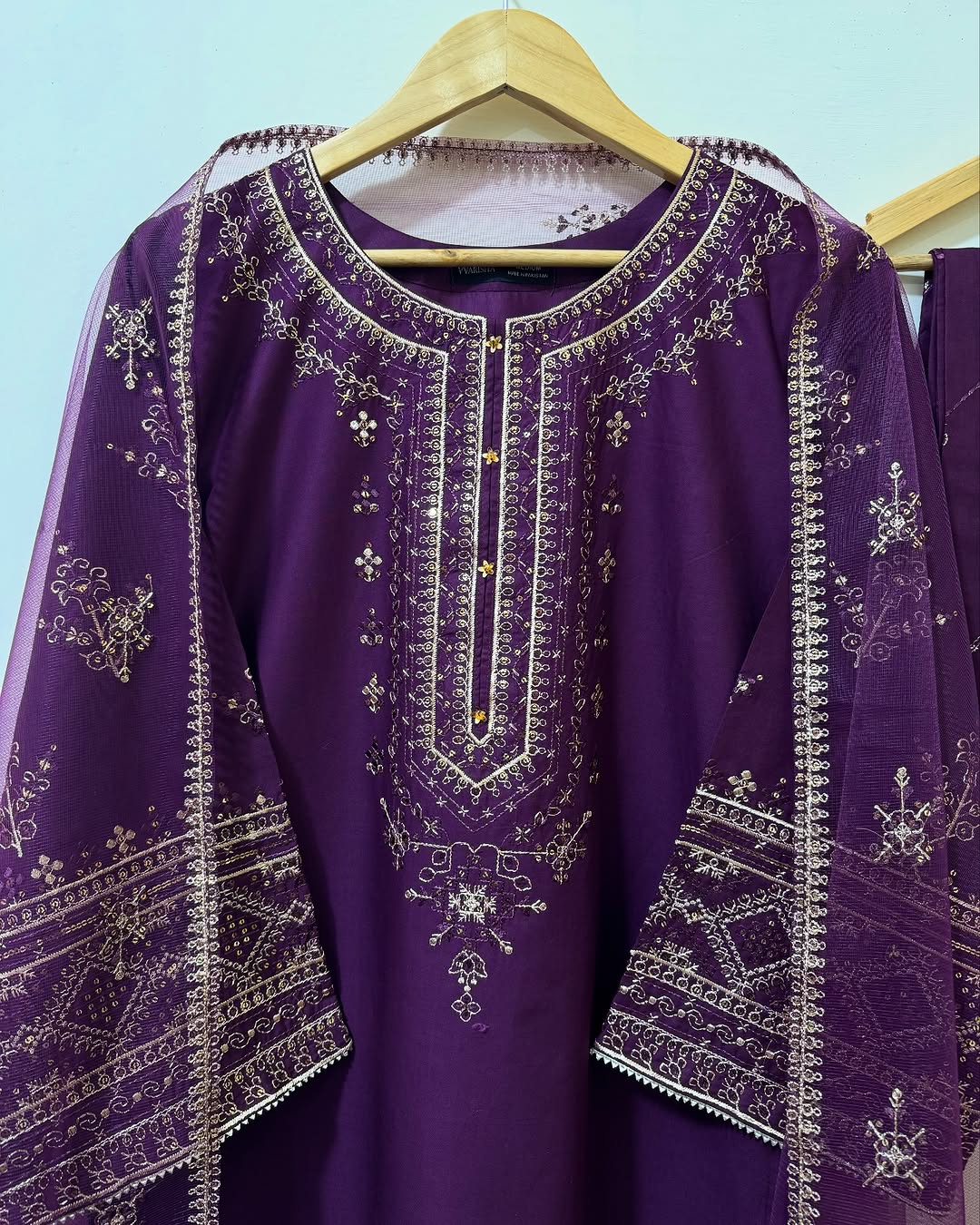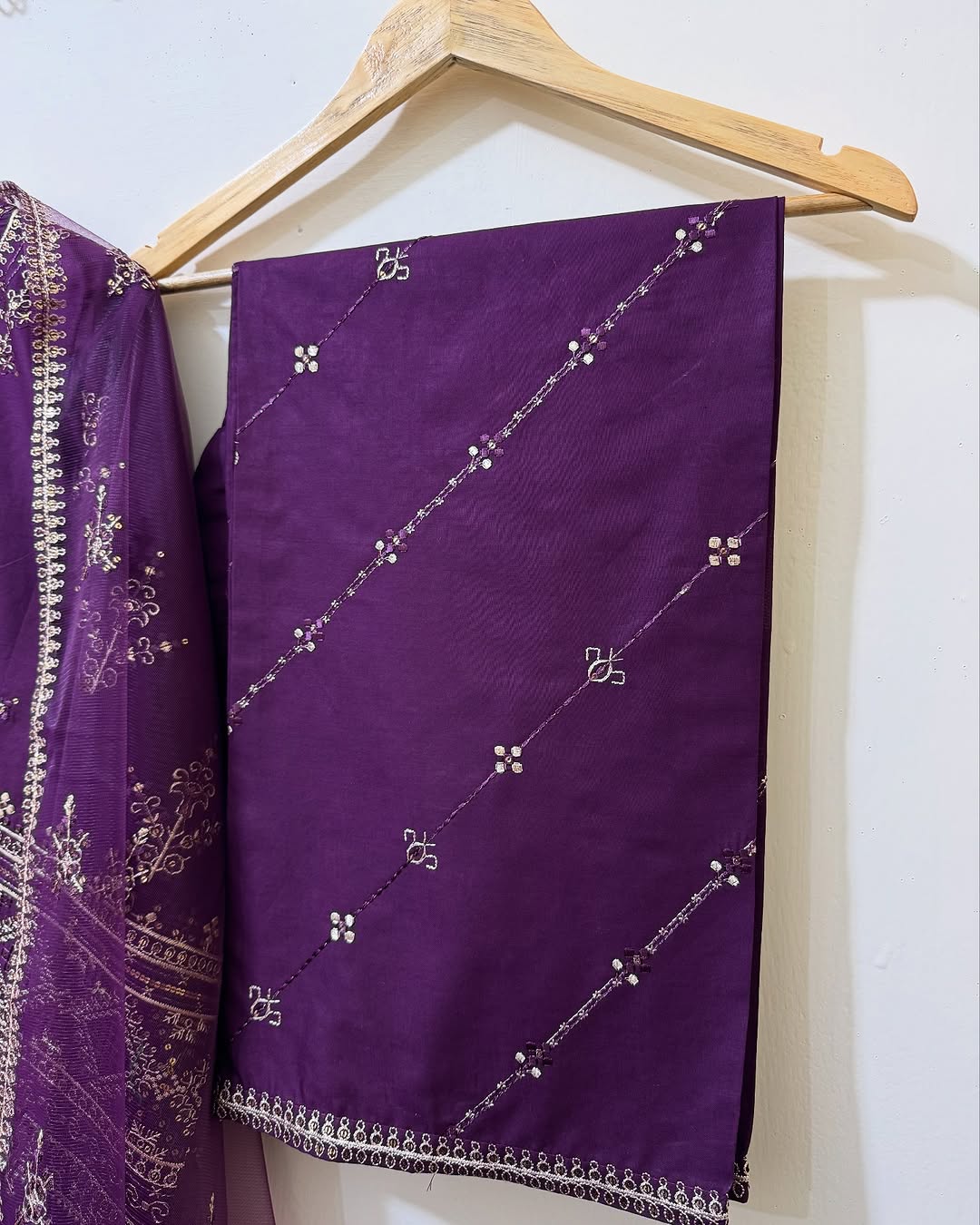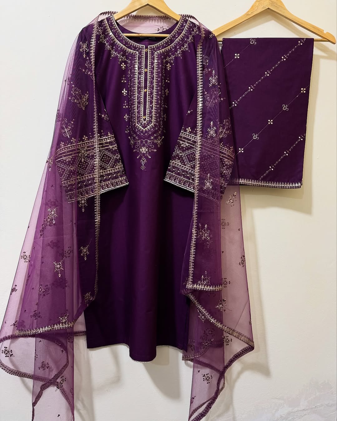 আপনার ফ্যাশনের তালিকায় যোগ করুন এই থ্রি-পিস সেটটি, যা বিশেষ কারচুপি এবং সূক্ষ্ম এম্ব্রয়ডারির এক নিখুঁত উদাহরণ।
